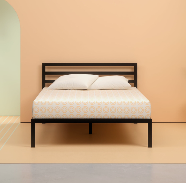 Made with bold style and optimum strength, the steel framed Mia Platform Bed with Headboard features a thick black metal frame and wooden slats that provide strong support for your memory foam, latex or spring mattress without the need for a box spring. And at 14 inches high, it offers over a foot of clearance under the frame for valuable under bed storage so you can tuck your extra boxes or bins neatly away. Crafted with clean lines and a streamlined look, this contemporary modern design looks classic and composed in just about any home. We ship this bed and everything you need to seamlessly assemble it in one slim and compact box that arrives at your doorstep. It’s all ready to be set up in under an hour with the help of a friend. And best of all, it includes a 5-year worry-free warranty guaranteed to keep you from ever losing any sleep over this purchase. Who would have guessed that stylish and strong mattress support could be this simple, convenient and affordably priced?